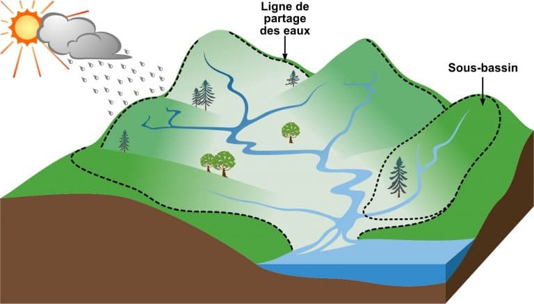 Un bassin versant désigne l’unité territoriale où toutes les eaux de surface s’écoulent naturellement vers un même point appelé « exutoire du bassin versant ». Ce territoire est délimité physiquement par la ligne suivant la crête des montagnes, des collines et des hauteurs du territoire, appelée « ligne de crêtes » ou « ligne de partage des eaux ».