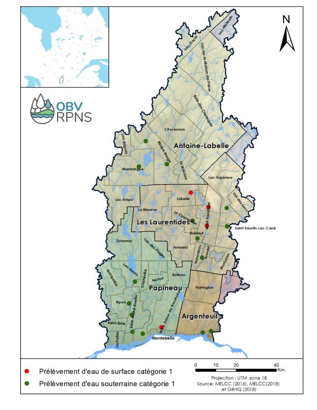 Les prélèvements de catégorie 1 comprennent tout captage desservant un système de distribution d’eau potable municipal fournissant plus de 500 personnes et au moins une résidence. Le territoire de l'OBV RPNS compte 15 prélèvements d'eau souterraine de catégorie 1 et 4 prélèvements d'eau de surface de catégorie 1.